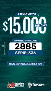 El sábado 13 de septiembre de 2025 se celebró el Sorteo 4589 de la Lotería de Boyacá, donde el gran Premio Mayor de $15.000 millones fue para el número 2885 de la serie 336. 💸🎉